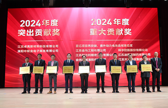 董事長丁山華(右一)上臺頒發2024年度溧陽高新區突出貢獻獎及重大貢獻獎