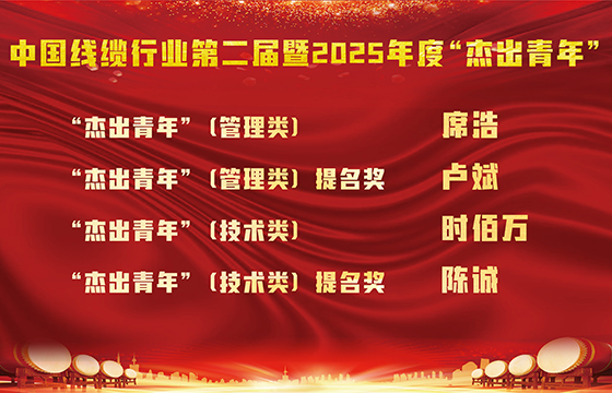5月4日,在五四青年節之際,由中國線纜網組織的中國線纜行業第二屆暨2025年度“杰出青年”評選結果揭曉,江蘇上上電纜集團四位青年脫穎而出。新能源事業部席浩、企管辦盧斌分別榮獲管理類“杰出青年”及提名獎;技術中心時佰萬、裝備部陳誠分獲技術類"杰出青年"及提名獎。