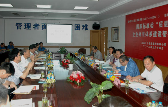 9月14日,國家標準化管理委員會巡視員廖曉謙一行來到江蘇上上電纜集團,組織進行質量月企業標準體系建設幫扶活動,上上集團是江蘇省三家幫扶企業之一。會議由江蘇省質監局標準化處調研員鐘衛東主持。集團董事長、總經理丁山華、管理者代表副總經理朱洪祥等公司領導出席會議。